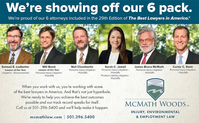 Six McMath Wood P.A. lawyers, including Carter C. Stein, Sarah C. Jewell, James Bruce McMath, Neil Chamberlin, Will Bond, and Samuel E. Ledbetter, were recently recognized by The Best Lawyers in America®️ in the 29th edition of the publication. Mr. Bond and Mr. Ledbetter were additionally recognized as “Lawyer of the Year” for their respective handling of Little Rock personal injury and environmental law cases.